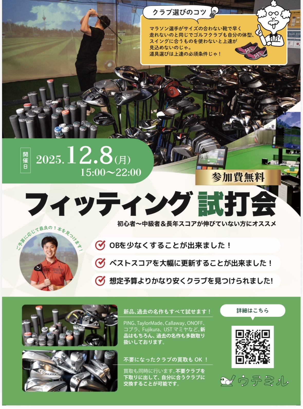 ※クラブ、シューズはレンタル(無料)があります。もちろん、お手持ちのクラブをお持ちいただいても大丈夫です。